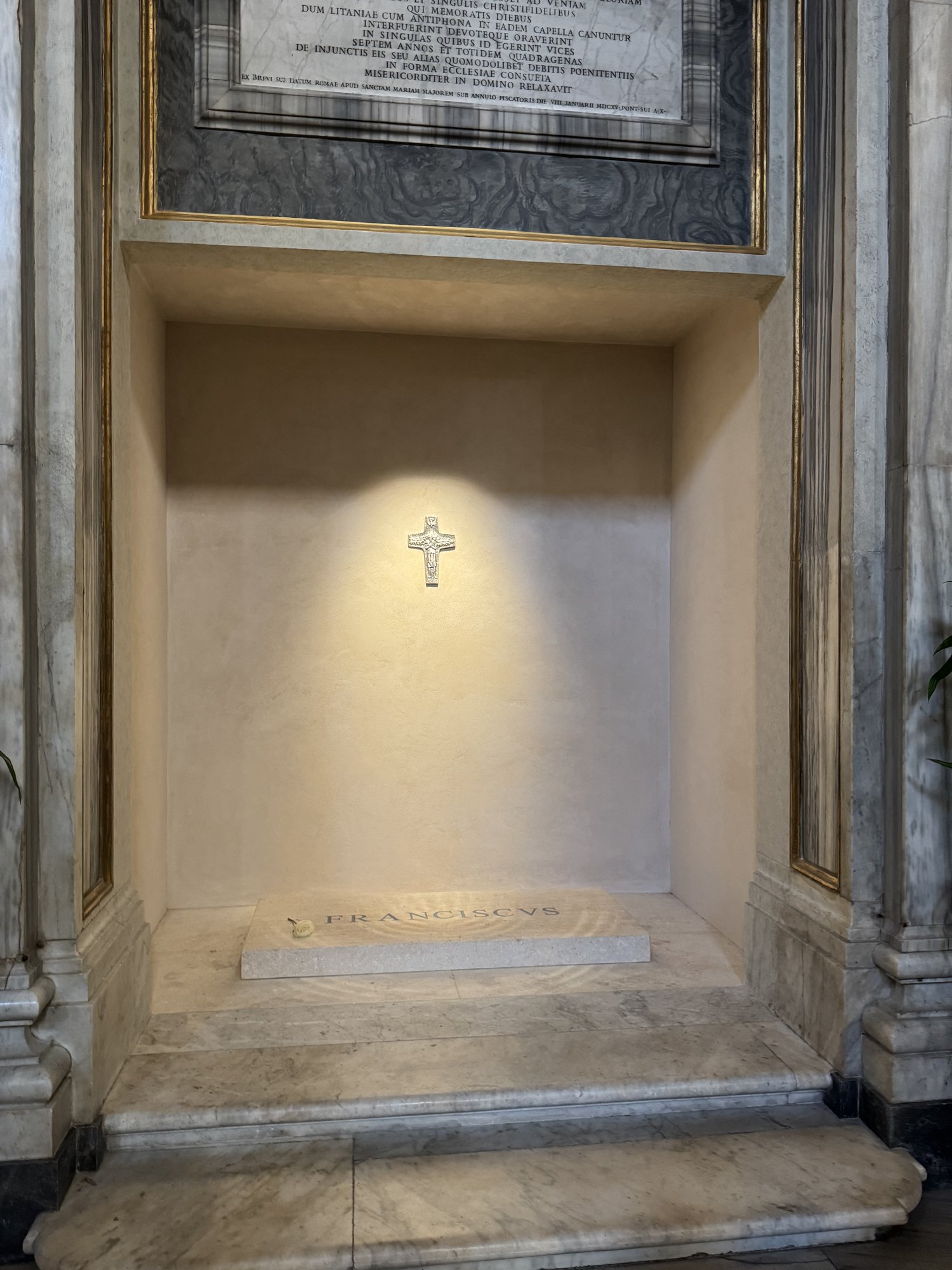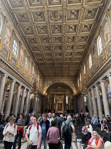 Nach so vielen Eindrücken, kommt die Mittagspause gerade recht, die, wir sind in Rom, wie soll es also anders sein, mit Pizza essen verbracht wurde. Im Anschluss geht es weiter, zur Basilika Santa Maria Maggiore. Bei der Ankunft wird klar, was zu dieser Wallfahrt auch gehört ist, das Anstehen und Abwarten. Doch das trübt die Stimmung in der Gruppe nicht. Beim Warten wird geplaudert und gebetet, sich ausgetauscht oder sinniert. In der Zwischenzeit gesellte sich auch Bischof Wiesemann zur Gruppe, der via Kopfhörer der Pilgergruppe beim Durchschreiten der Heiligen Pforte on Santa Maria Maggiore einige besinnliche Gedanken mitgab. Wer die Kirche erkunden wollte, konnte dies gemeinsam mit einer Touristenführerin machen. Und dann hieß es nochmal anstehen, um einen besonderen Moment vor dem Grab von Papst Franziskus zu erhaschen und für ihn zu beten.