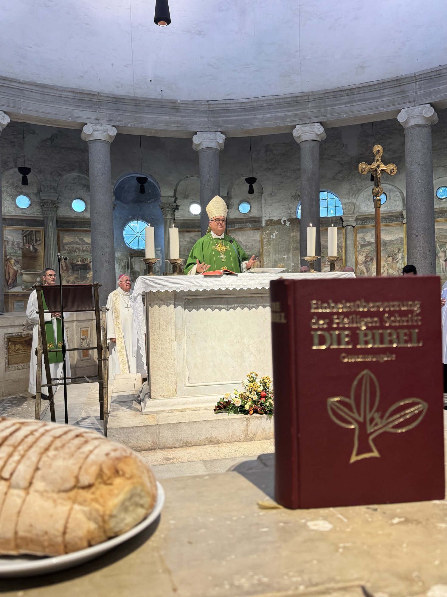 Ein gemeinsamer Eröffnungsgottesdienst in der Kirche Santo Stefano Rotondo, die bereits seit der Antiken existiert und mit ihrer runden Anordnung und ihren in den Himmel ragenden Säulen ein erhabenes Gefühl auslöst, gaben dem ersten Wallfahrtstag einen feierlichen Rahmen. Bischof Wiesemann, Weihbischof Georgens, Generalvikar Magin und zahlreiche Priester und Diakone der Diözese feierten mit der Pilgergruppe die Gemeinschaft. Bischof Wiesemann begrüßte, die Pilgerinnen und Pilger, darunter auch jene, die zu Fuß nach Rom gekommen sind, die Teil der Staffelpilger-Gruppe waren, die sich bereits im Juli auf den Weg in die ewige Stadt gemacht haben. Bischof Wiesemann: „Wir können hier gemeinsam in Rom, in diesen heiligen Stätten, unserem Glauben neu Kraft und Lebendigkeit geben in der großen Weltgemeinschaft der Kirche, die hier in Rom so unmittelbar erfahrbar wird.“ Alle Pilgerinnen und Pilger konnten zu Beginn des Gottesdienstes ihr Taufversprechen erneuern und als „Kinder Gottes“ vor Gott ein Zeugnis ablegen. Der Wallfahrtschor, der sich für diese Reise gegründet hat, gestaltete den Gottesdienst musikalisch und zeigte wie sehr die Musik die Herzen berührte.