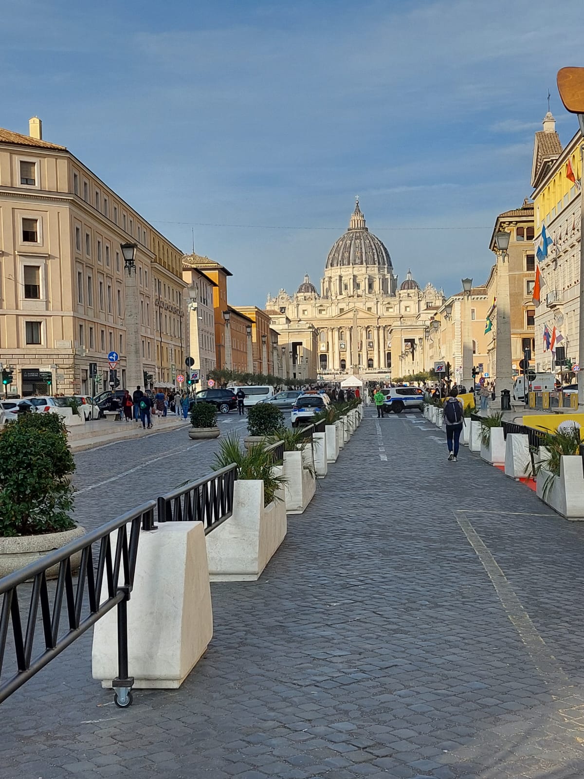 Der Morgen des zweiten Tages startete mit einem beeindruckenden und bewegenden Pilgerweg von der Engelsburg über die Via de la Conciliazione, über den Petersplatz in die Peterskirche. Gemeinsam beteten wir, verbunden über die Kopfhörer, vorne weg abwechselnd Pilgerinnen und Pilger, die ein Holzkreuz trugen und die Gruppe leiteten. Das Tragen des Kreuzes löste tiefe Berührung aus. Der Weg führte vom Obelisken auf dem Petersplatz hinein in den Petersdom durch die Heilige Pforte. Angekommen im Petersdom feierte die Reisegruppe einen Gottesdienst. Ein erhabenes Gefühl machte sich breit, in diesem denkwürdigen Dom, gemeinsam eine Messe zu feiern.