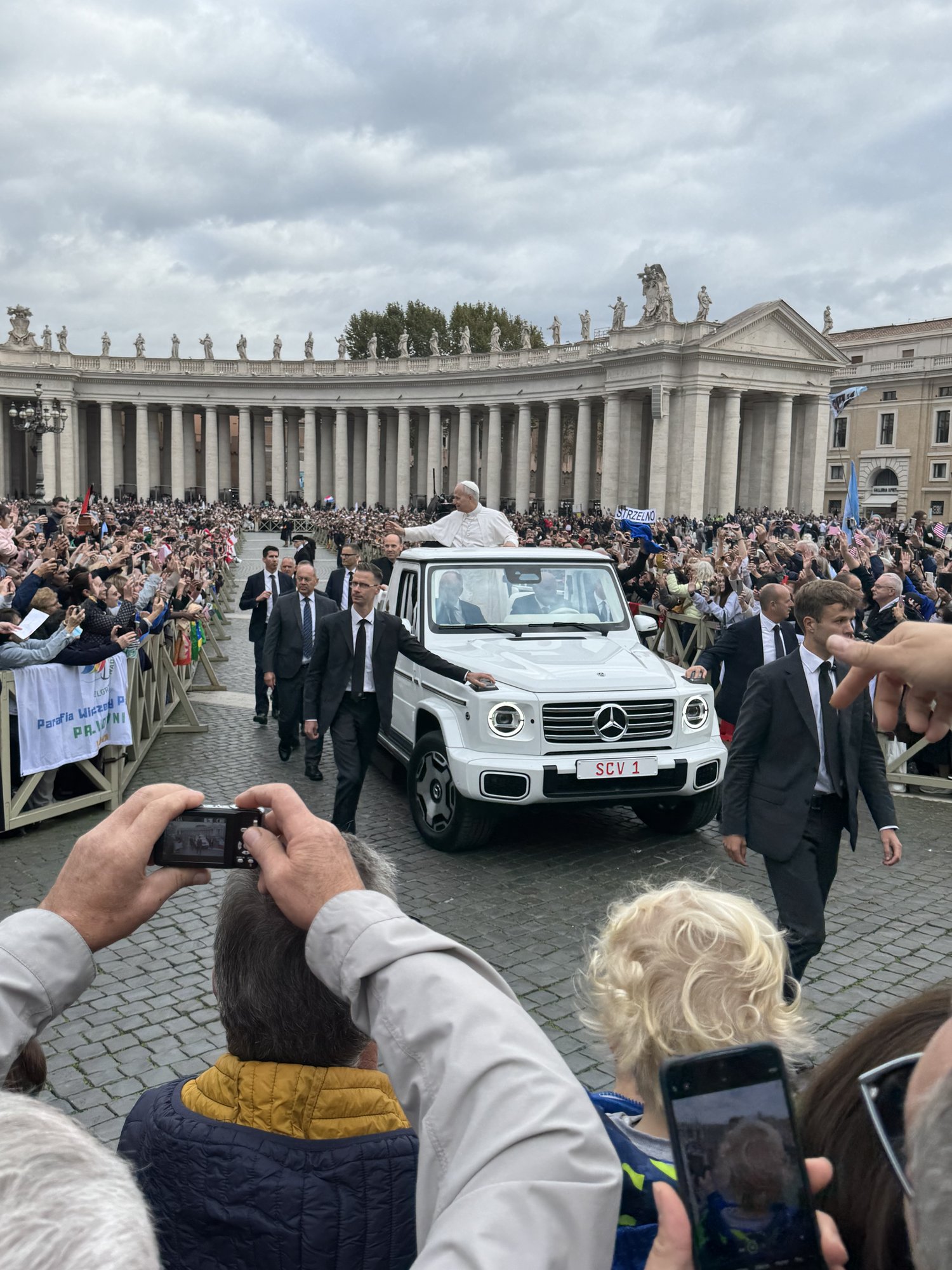 Ein wahrlich aufregender Tag liegt hinter uns oder mit anderen Worten: Dieser Tag war der Höhepunkt unserer Wallfahrt. Bereits um 6.45 Uhr ging es mit den Bussen von unseren Hotels aus los Richtung Petersplatz, denn heute stand die Generalaudienz mit Papst Leo XIV. auf dem Tagesprogramm. Neben den 357 Pilgerinnen und Pilgern aus Speyer wurden weitere 60.000 – 80.000 Gläubige erwartet. Eine unbeschreibliche Zahl, die in den vollen Straßen Roms spürbar war. Das Ziel war es natürlich: Papst Leo so nahe wie möglich zu kommen und eins oder auch zwei, oder vielleicht auch mehrere Fotos als Erinnerung mitnehmen zu können. Als wir auf dem Petersplatz ankamen, hieß es erstmal durchatmen: Die erste Hürde war geschafft. Und mit Blick auf die Uhr war auch gar nicht mehr viel Zeit, um einen guten Stehplatz zu ergattern. Kurz vor 10.00 Uhr erblickten wir ihn dann, wie er mit seinem Papamobil durch die abgesperrten Wege bis zum Petersdom fuhr. Ein wirklich besonderer Moment! Aufregung macht sich in der Gruppe breit, es wurde gejubelt und gerufen!