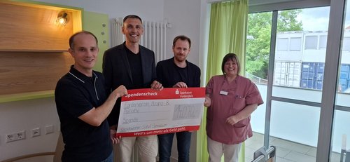 Tobias Wrzezinski, Axel Kempter, Jens Lackmann und Stationsleiterin Beatrice Kaube (von links) freuen sich über die erlaufene Spendensumme. © Förderverein Hospiz und Palliativ