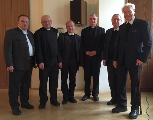 Beim Gedenktag des Seligen Nardini (v.r.n.l.): Bischof em. Dr. Anton Schlembach, Weihbischof Otto Georgens, Bischof Dr.Karl-Heinz Wiesemann, Mons. Pirmin Spiegel, Domkapitular Josef Szuba, Pfarrer Arno Vogt.