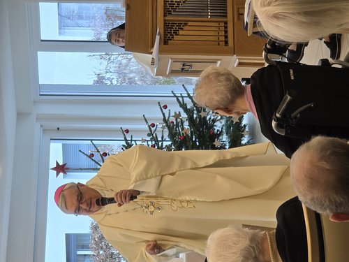 Gemeinsam mit den Senioren – die älteste Bewohnerin des Caritas-Altenzentrums ist 102 Jahre alt – feierten die Kinder den Weihnachtsgottesdienst mit dem Bischof. „Ich bin froh, dass wir ihn als Bischof haben“, zeigte sich Thomas Matz von der Predigt tief beeindruckt. Der große Aufenthaltsraum, in dem Gottesdienst gefeiert wurde, war bei dieser bis auf den letzten Platz gefüllt.