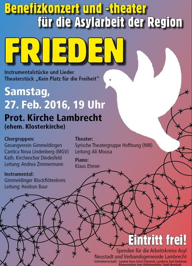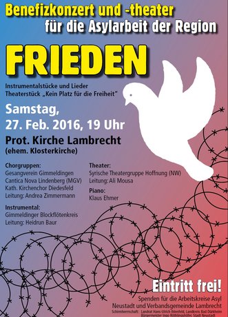 Lambrecht. "Frieden" lautet der Titel eines Benefizkonzertes für die Asylarbeit in Neustadt und in der Verbandsgemeinde Lambrecht. Es findet statt am Samstag, 27. Februar, um 19 Uhr in der protestantischen Kirche Lambrecht (ehemalige Klosterkirche).