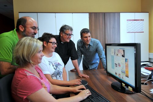 Das Redaktionsteam legt letzte Hand an, damit der neue Internetauftritt wie geplant online gehen kann. Im Bild (sitzend vorne): Die beiden Pfarrsekretärinnen Kerstin Müller und Simone Schneider mit Pastoralreferent Oliver Wagner dahinter. Daneben stehen Pfarrer Berthold Koch und Marco Fraleoni, der als Projektinitiator der Webseiten-Familie zugleich der Geschäftsführer von Peregrinus ist.