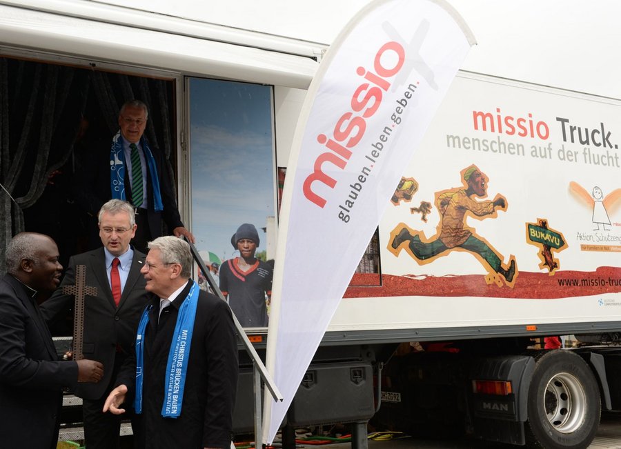 Bundespräsident Joachim Gauck besuchte den missio-Truck während des Katholikentages 2014 in Regensburg