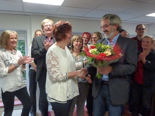 Blumen zum 25.- Mitarbeiter Klaus Schweitzer gratuliert der Leiterin des Cari-tas-Förderzentrums St. Lukas.