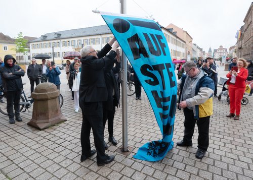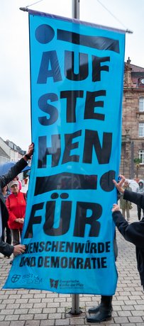 Speyer. Aufstehen für Menschenwürde und Demokratie – unter diesem Motto starteten am 17. Mai das Bistum Speyer und die Evangelische Kirche der Pfalz ihre gemeinsame Initiative. Vor dem Dom hissten Bischof Wiesemann und Kirchenpräsidentin Wüst die ersten Flaggen der Kampagne.