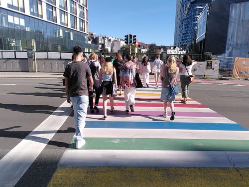 Nachmittags hatten wir eine Stadtführung von L-Tours, die Lesben- und Regenbogentouren und Veranstaltungen organisieren, um die Geschichte der Brüsseler LGBTQ+ -Community mit der Hilfe von queeren Menschen und Organisationen zu fördern und in die Welt zu tragen. Marian Lens, die unsere Führung leitete, ist selbst als Jugendliche in den 60ern vom Land vor der dortigen Lesbenfeindlichkeit geflüchtet und konnte zu allen Orten, die wir während der Tour besuchten, von ihren eigenen Erfahrungen erzählen. Zum Beispiel zu vielen ehemalige Lesbenbars, heutzutage gibt es im Gegensatz etwa nur noch eine Lesbenbar außerhalb des Stadtkerns, jedoch aber sehr viele Schwulenbars innerhalb des Stadtkerns, und dem „Rainbow House“ (Regenbogenhaus), welches den Mittelpunkt für LGBTQ+ Organisationen und Veranstaltungen ist, wo sie auch selbst als Aktivistin tätig ist.