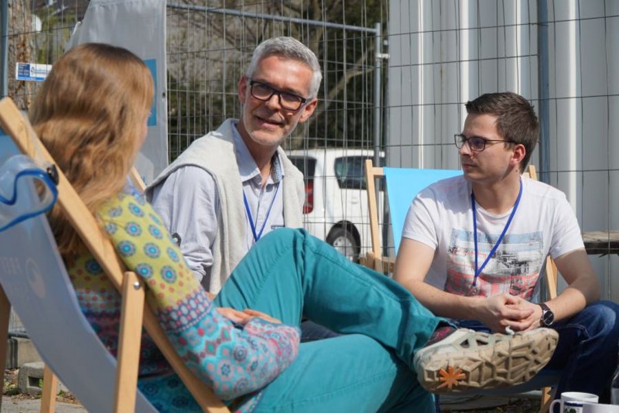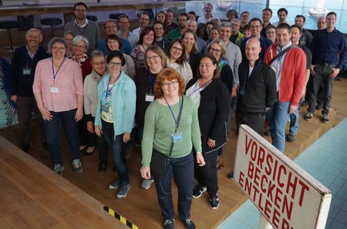 Ludwigshafen. Eine ungewohnte Kulisse für Kirche: Rund 90 Menschen saßen dicht gedrängt auf dem Grund des zum Podium umfunktionierten alten Schwimmbeckens im Start-Up- und Innovationszentrum „Freischwimmer“ in Ludwigshafen und diskutierten neue Ideen für ihre Gemeinden. Zwischen blau-türkisen Schwimmbadkacheln und Liegestühlen fand hier das erste Come-and-Go-Seminar des Bistums Speyer und der evangelischen Kirche der Pfalz statt. Von Freitag, 5. April bis Sonntag 7. April standen Inputs, Workshops, Vernetzung im Zentrum. Es kamen Haupt- und Ehrenamtliche, Katholiken und Protestanten, junge und ältere Interessierte. Was sie verbindet ist ein Interesse an Kirche und der Wunsch, diese in neuen Formen mit Menschen zu gestalten, zu denen Kirche bislang keinen Kontakt hat. Während manche Teilnehmer von Freitag bis Sonntag dabei waren, nutzten andere das Angebot, nur bestimmte Themenblöcke zu besuchen.