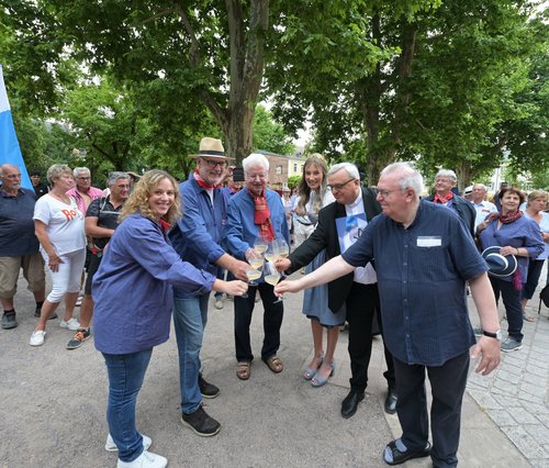 „Mein Keller ist leer, aber ich habe Hoffnung“, begrüßte Weihbischof Otto Georgens die Kirrweilerer Delegation. Der Weinort Kirrweiler habe ihm bereits in der Vergangenheit viel Freude gemacht, der als ehemalige Sommerresidenz der Speyerer Fürstbischöfe eine besondere Bedeutung habe. Traditionell schloss er seine kurze Ansprache mit einem Reim: „Wär‘ der Wein verboten, weil dieses Gottes Sinn, stünd‘ in den 10 Geboten, dies ganz bestimmt darin / Und weil da nicht geschrieben, dass man nicht trinken soll, hat Gott dies, meine Lieben, wahrhaftig nicht gewollt.“