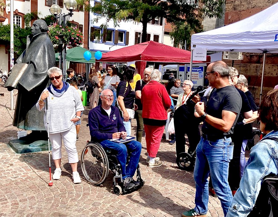 Auf dem Platz neben der Stiftskirche wartete im Anschluss bei schönem Sommerwetter ein buntes Erlebnisangebot auf die Besucher*innen. Die Infostände des Behindertenbeirates der Stadt Landau, des Clubs Behinderter und ihrer Freunde Südpfalz e. V. (cbf Südpfalz e.V.), des Blindenstammtisches Landau und der Evangelischen Blindenseelsorge, des Landessportbundes Rheinland-Pfalz und vielen anderen luden die Besucher*innen zum Verweilen und zum Informationsaustausch mit den Standbetreiber*innen ein.